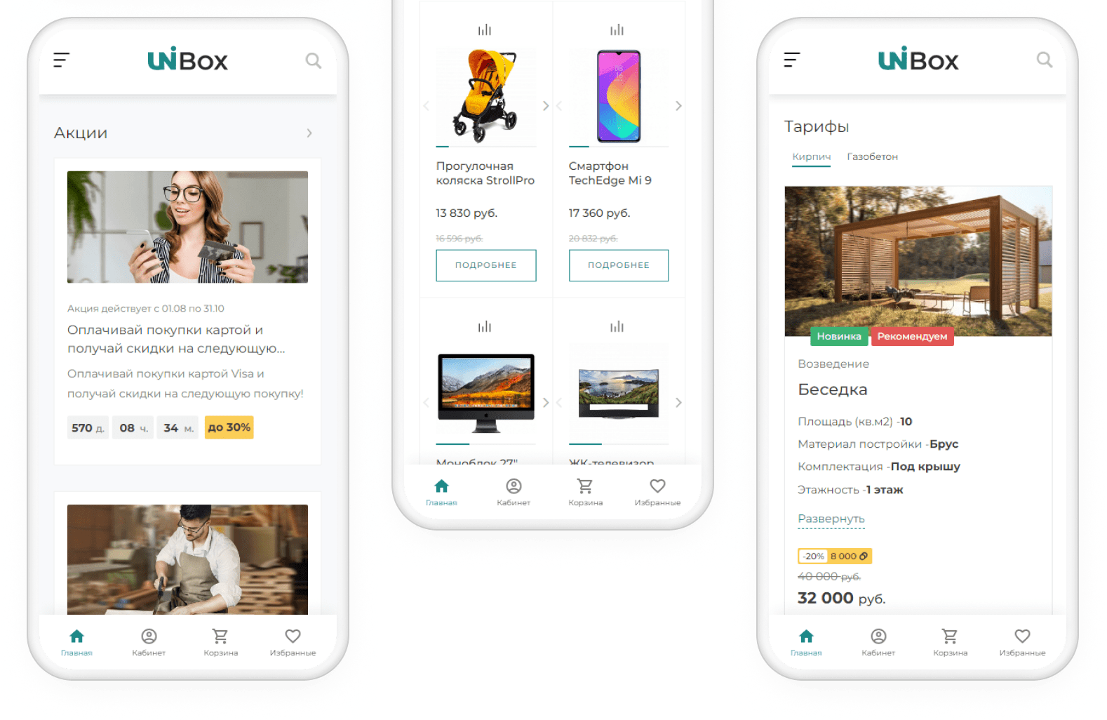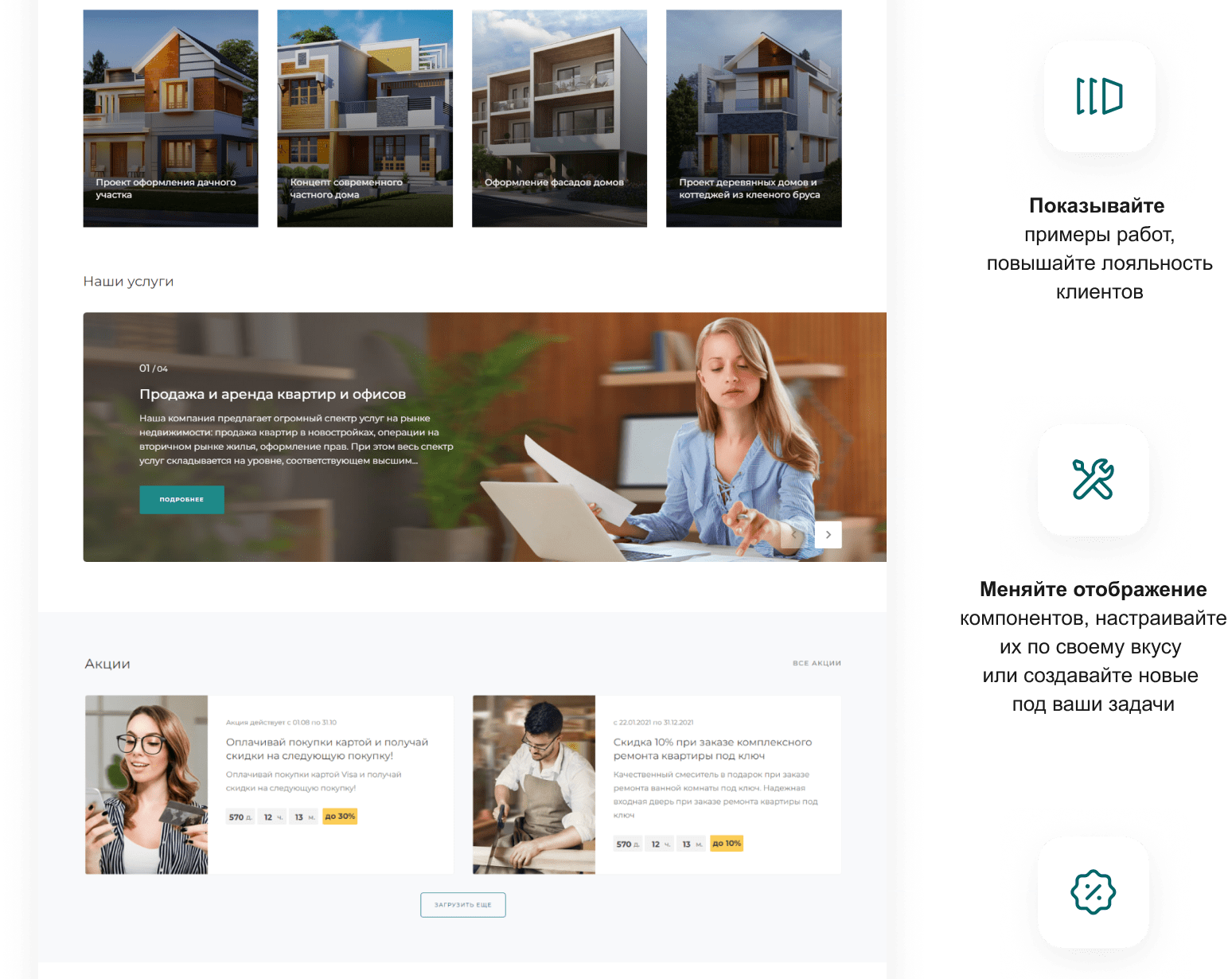 - Подгрузка дополнительных элементов новостей и акций на главной странице