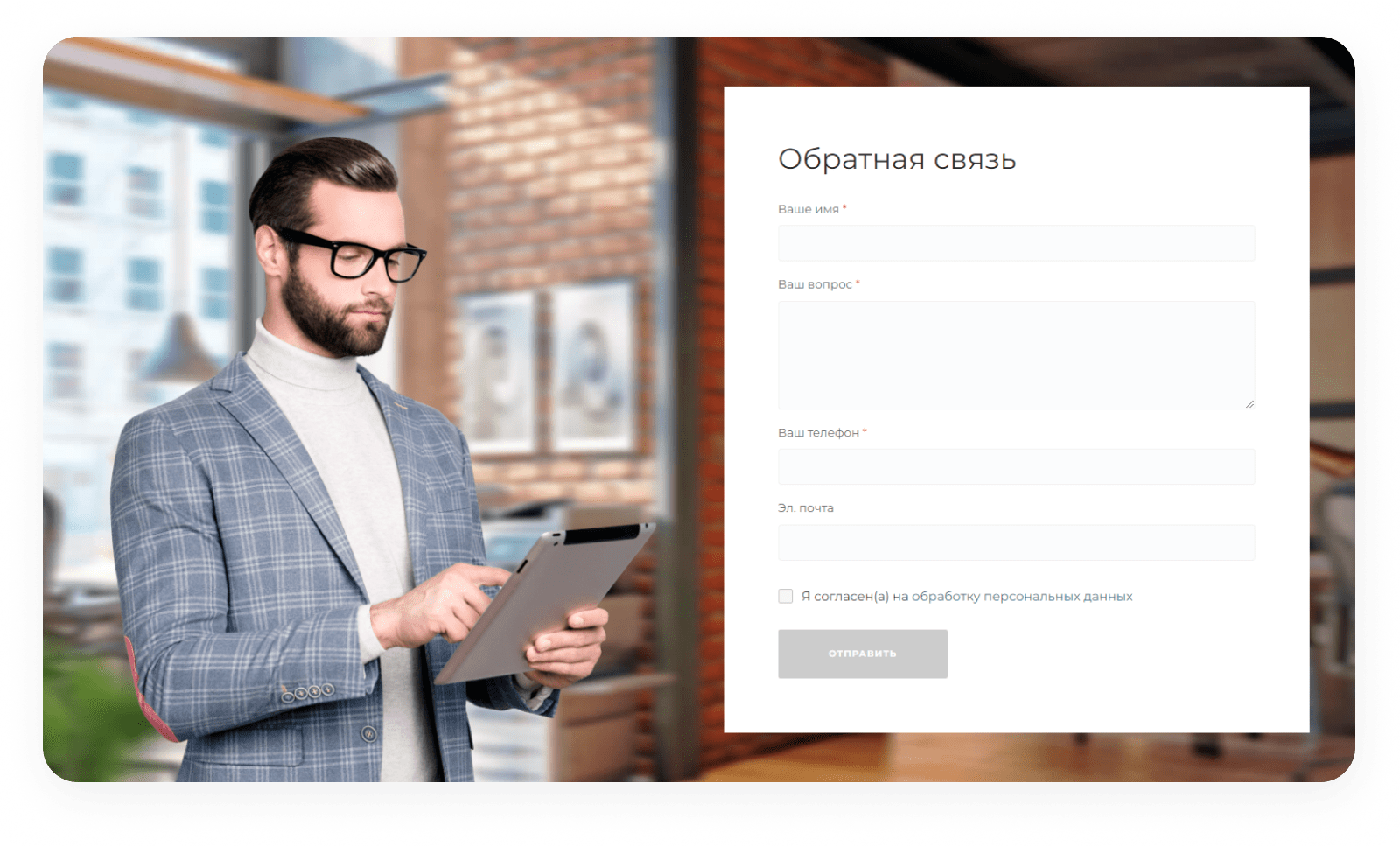 - Чекбокс о соглашении на обработку персональных данных по умолчанию отключен. Форма не отправится, пока пользователь не согласится с условиями
